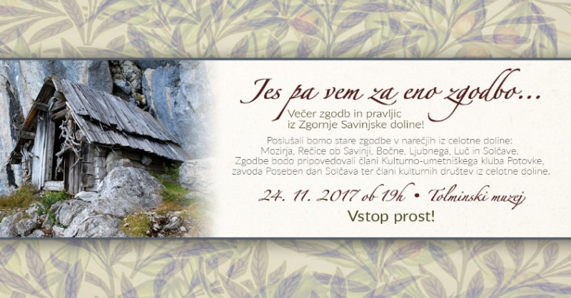 KUD Breza in Tolminski muzej vas ponovno vabita na jesenski pravljični večer: k nam prihajajo v goste pripovedovalci iz Zgornje Savinjske doline, ki bodo prinesli s seboj stare zgodbe iz Mozirja, Rečice ob Savinji, Bočne, Ljubnega, Luč in Solčave. Pripovedovali in peli bodo v mnogih narečjih iz celotne doline.