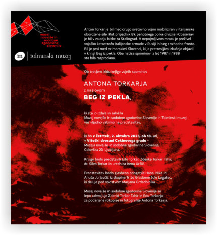 Sodelovanje Muzeja novejše in sodobne zgodovine Slovenije ter Tolminskega muzeja je privedlo do tretjega izdida knjige spominov Antona Torkarja z naslovom Beg iz pekla.