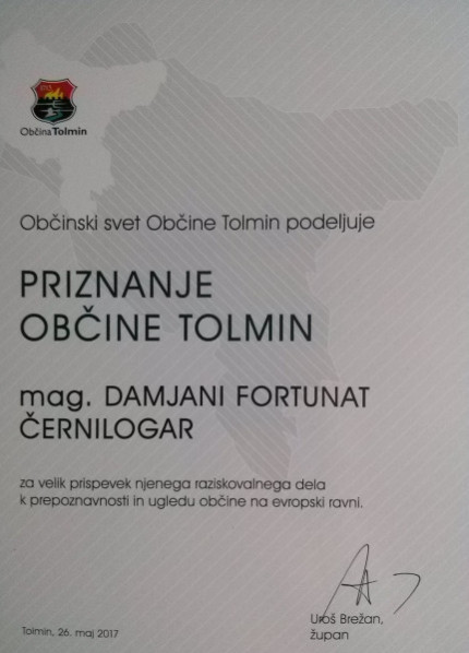 V petek 26. maja 2017 pa je mag. Damjana Fortunat Černilogar na slavnostni seji Občinskega sveta Občine Tolmin prejela tudi Priznanje Občine Tolmin. V obrazložitvi je izpostavljen velik prispevek njenega raziskovalnega dela k prepoznavnosti in ugledu občine na evropski ravni.